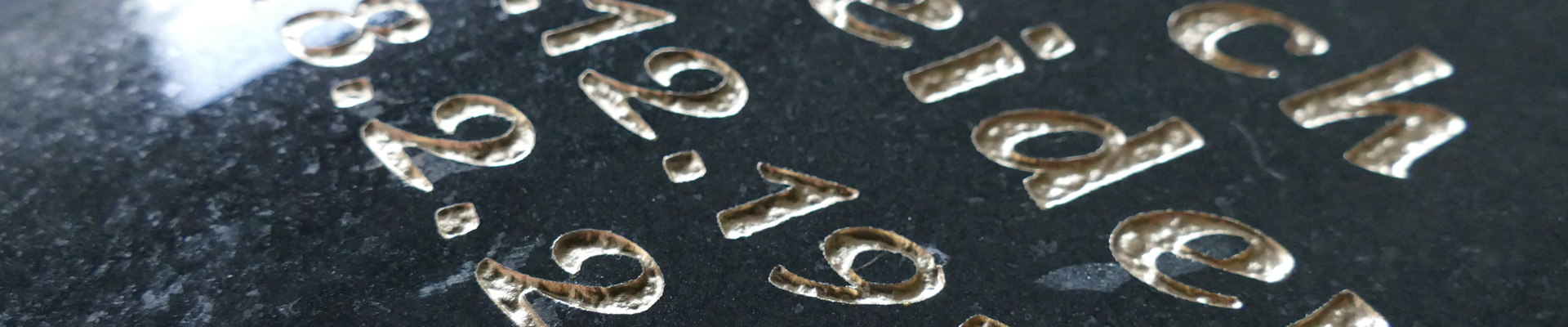 Eine Grabmal-Beschriftung wird entweder in den Stein graviert (hochwertige Sandstrahlgravur), geschlagen oder als Metallschriftzug aufgesetzt. Bei der ersten Variante erstellt der Steinmetz eine Sandstrahlgravur Ihrer Inschrift, die 2-3 mm tief in den Stein eingearbeitet und anschließend mit Ihrer Wunschfarbe ausgelegt wird.